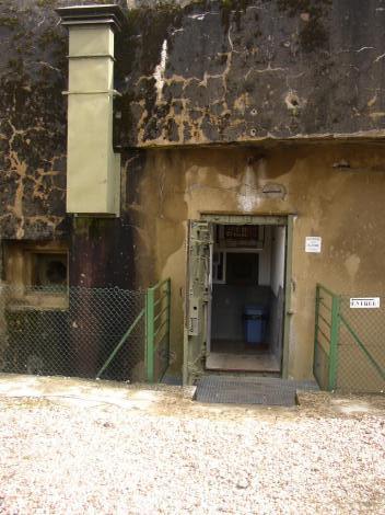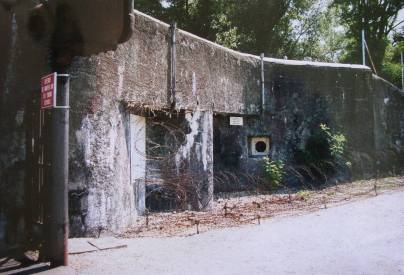 Intervallkasematte Hatten, der grüne Kasten im Vordergrund ist der gepanzerte Suchscheinwerfer | Eingang mit "Zugbrücke" der Intervallkasematte Hatten | |||||||