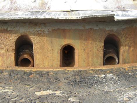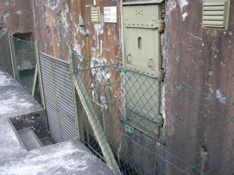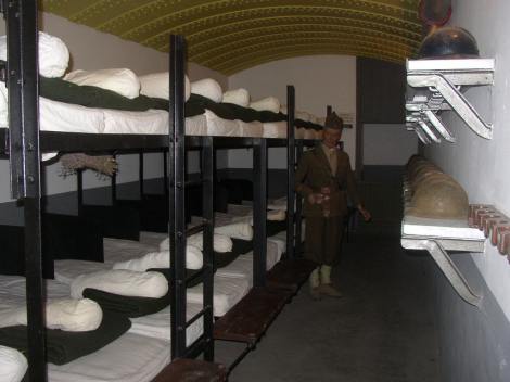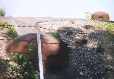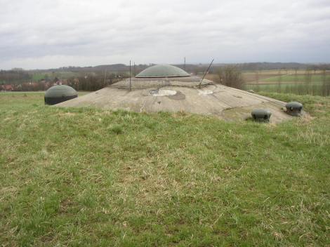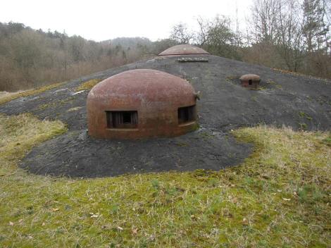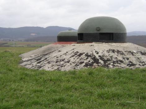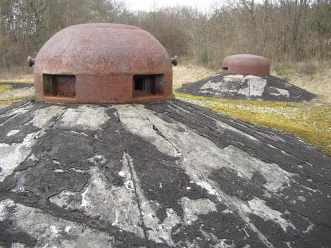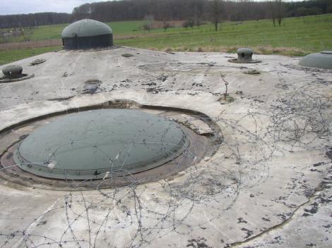 Die Hauptkampffront auf der rechten Seite, noch mit Stacheldraht | Die MG- und Beobachtungskuppeln aus zentimeterdickem Stahl | |||||||