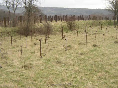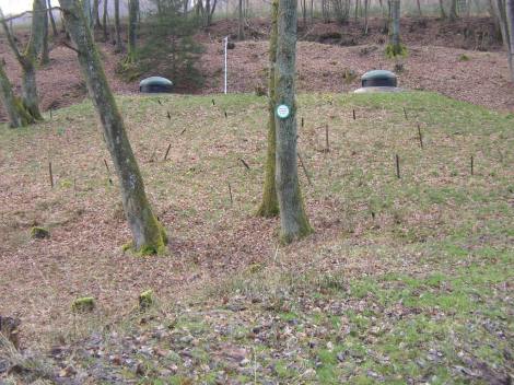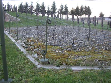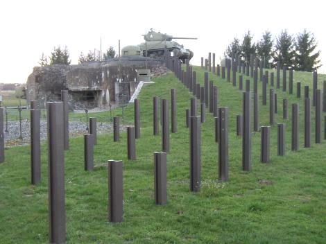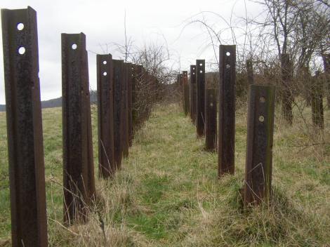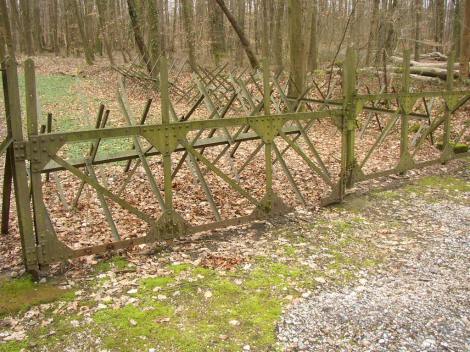In den Boden gerammte Eisenbahnschienen beim Großwerk Lembach | Stacheldrahthinderniss beim Großwerk Lembach | |||||||
