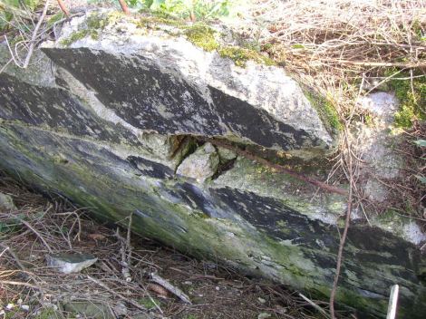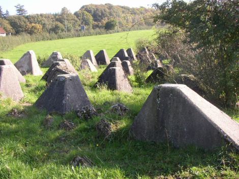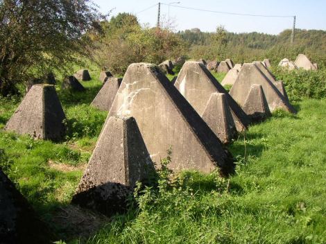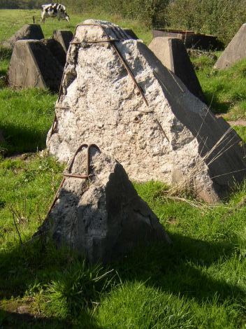 | Blick entlang der Höckerlinie, die als Panzersperre diente | Bei den angeschossenen / zerfallenen Höckern erkennt man die Stahlarmierung | |||||||