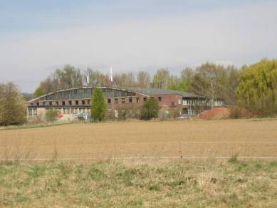 | Betonreste im abgesperrten Gelände (etwa ein betonierter Unterstand?) | Dieses Gebäude sieht zu modern aus, um zur Zeit des Fliegerhorstes schon gestanden haben zu können | |||||||