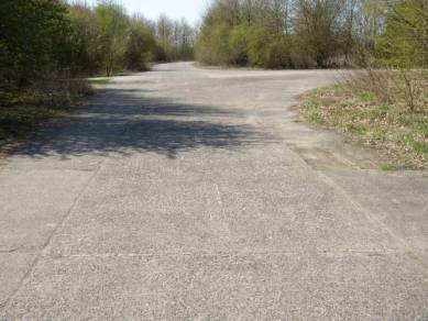 | Überblick über das betonierte Gelände vor dem Hangar, links sieht man die Reste des zweiten, inzwischen abgerissenen Hangars | Betonplattenstrasse, die von der Fahrzeughalle zum Hangar führt | |||||||